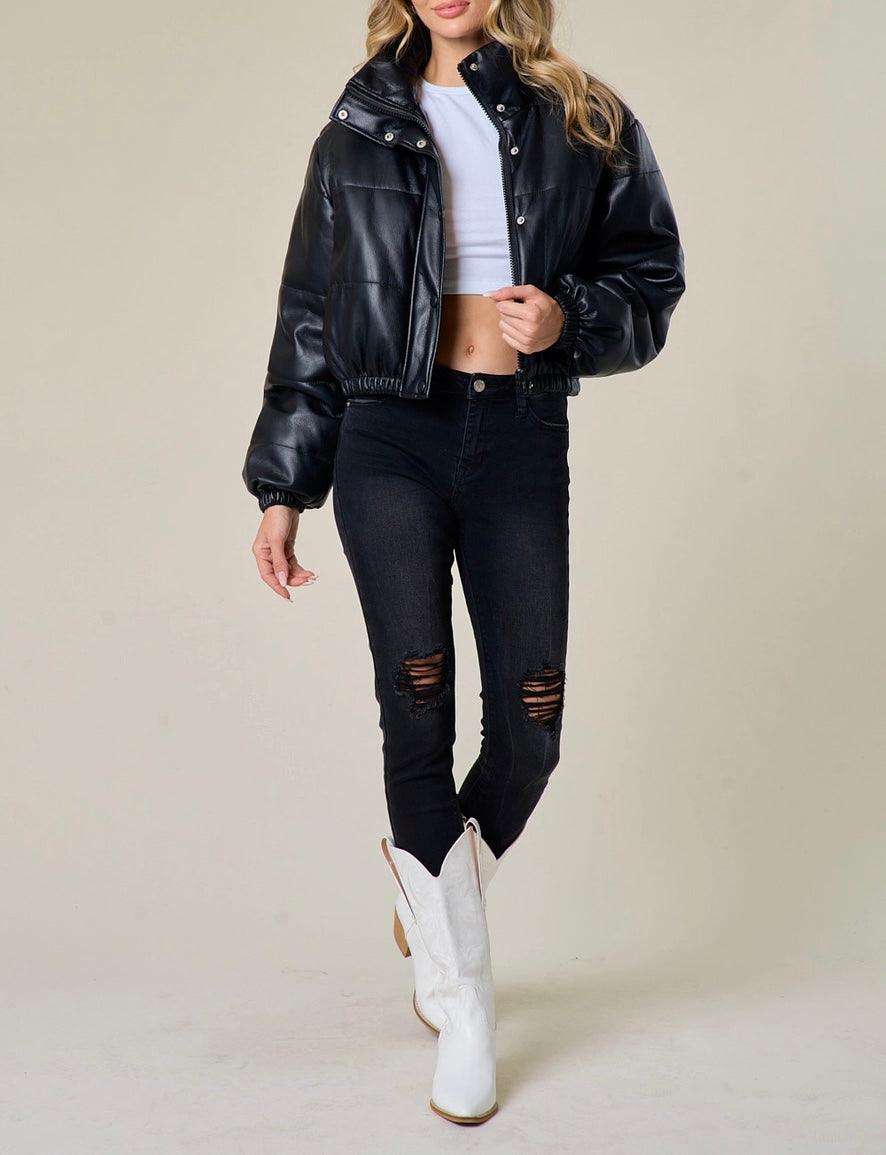 Stay warm and stylish with this faux leather puffer jacket. The jacket is so warm and comfortable, and features pockets, button & zipper closure and drawstring to tighten the inside for extra warmth! Such a perfect staple for this winter!