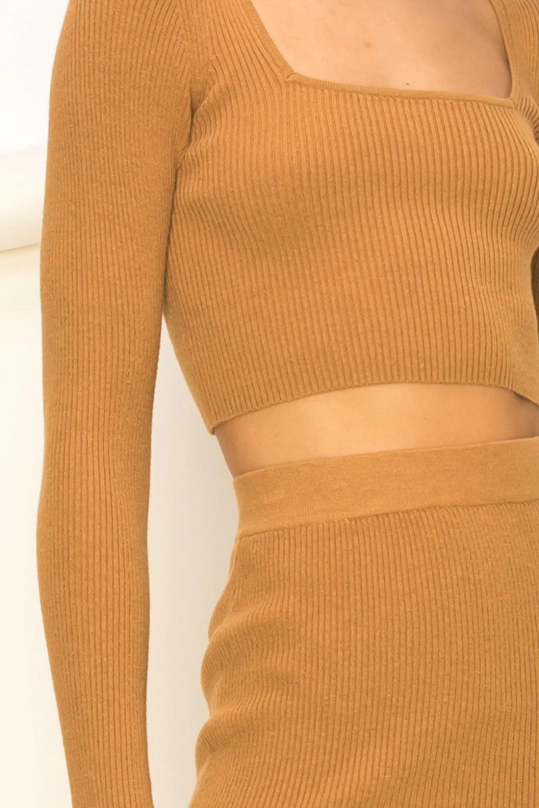 Two-piece set long sleeved crop top with a long slitted skirt.
