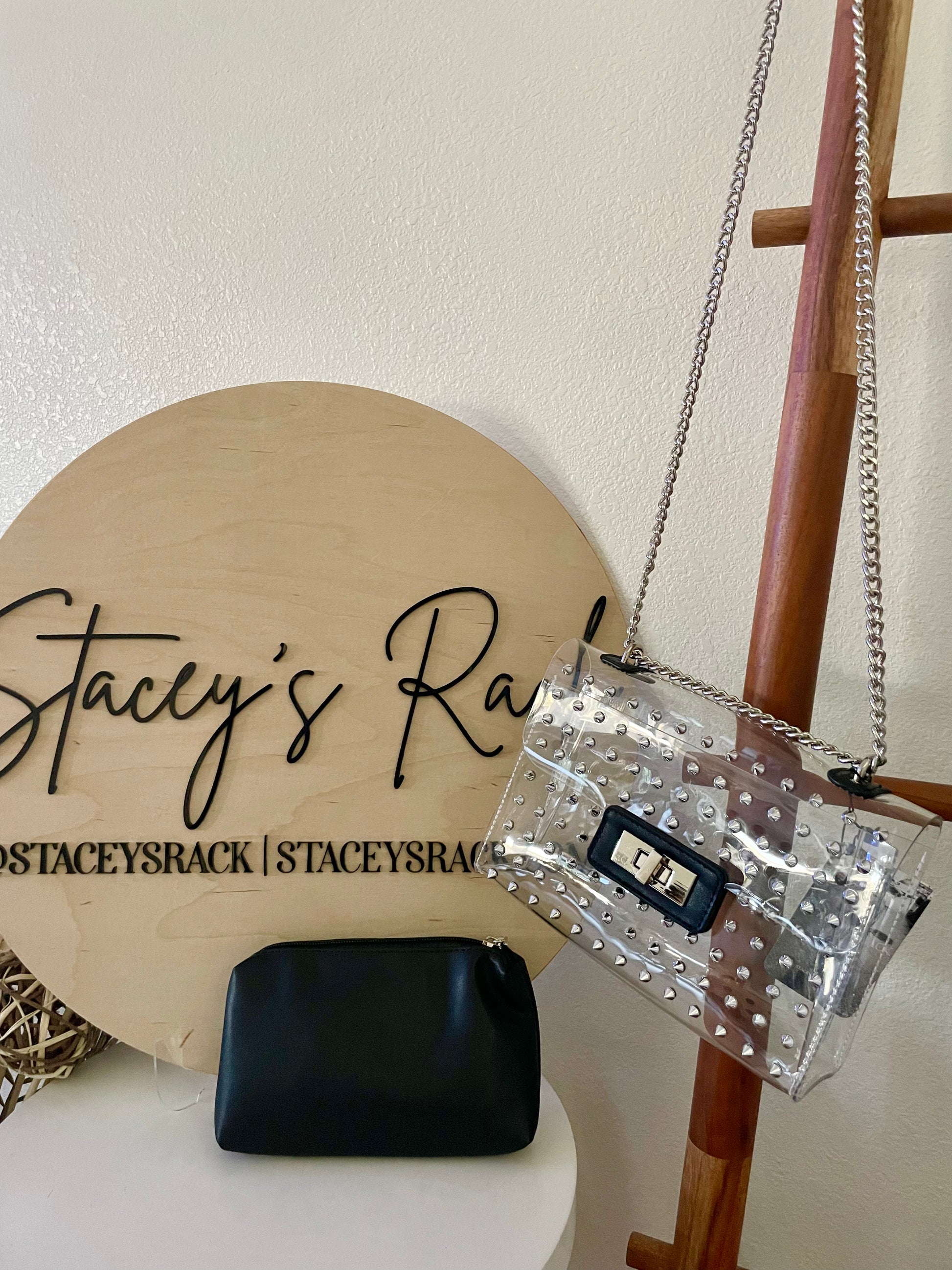 The Clearly Studded Bag is the perfect bag for your next event! It includes a black inserted zipper bag that is removable. beautiful studded detail across the front. The adjustable silver chain link strap can be adjusted to become a shoulder bag or a crossbody.